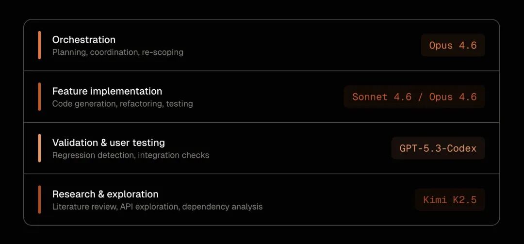 另外,Missions本身支持多模型,可以调用来自不同厂商、不同类型的AI模型担任执行智能体,调度器Droids则会根据任务自动选择最合适的模型。