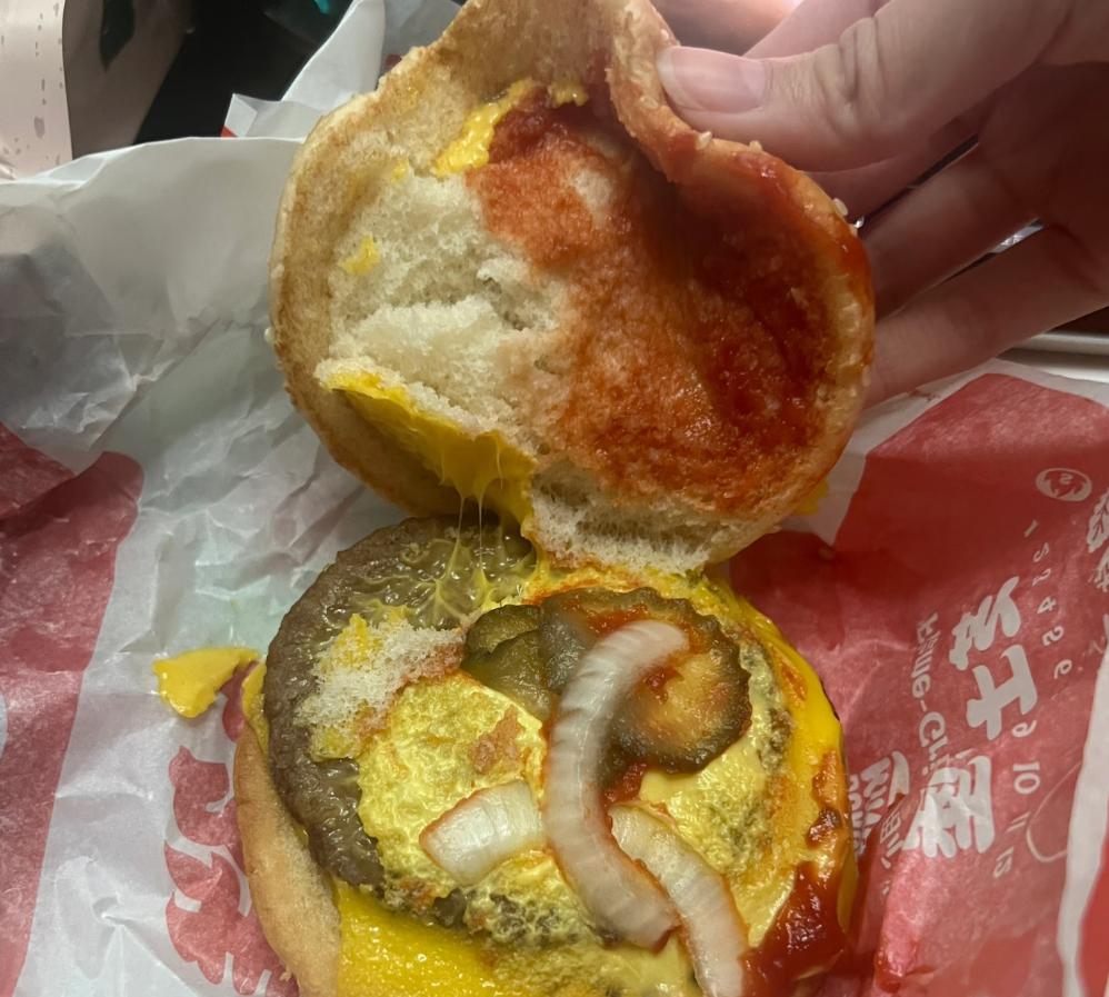 牛肉饼缩水,烤出来的肉饼干柴无味,没有丝毫汁水;面包胚放久了发硬,生菜发黄发蔫,酸黄瓜过期发酸,就连番茄酱,都变得稀稀拉拉,毫无味道。