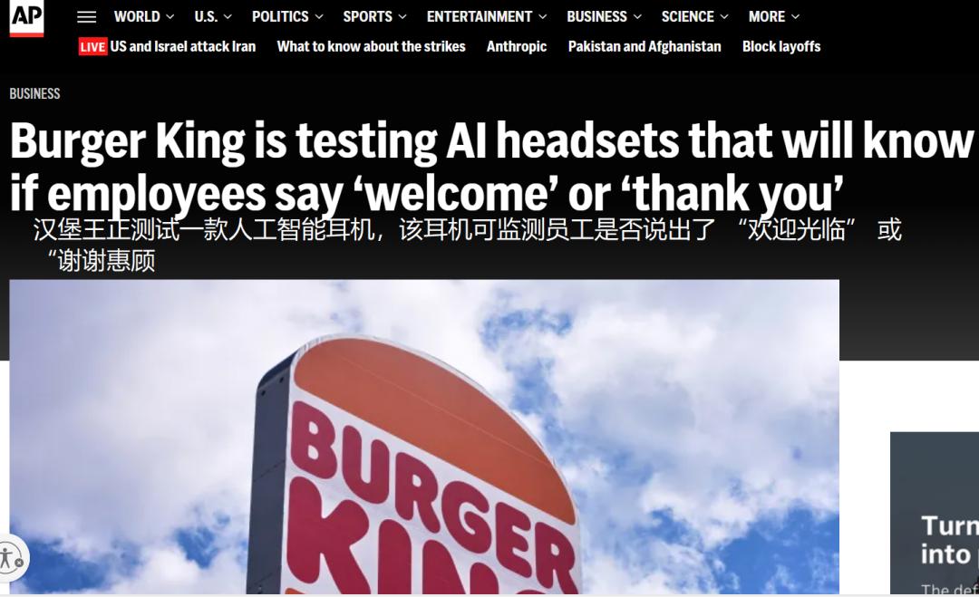 就在这两天,汉堡王在美国500家门店试点部署AI耳机系统,监测员工与顾客的对话。