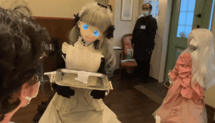 还有给宅男服务的机器人女仆,只要“召唤”女仆机器人就会来到桌子旁为你服务,她看着顾客的眼睛,弯着膝盖,礼貌地鞠躬。