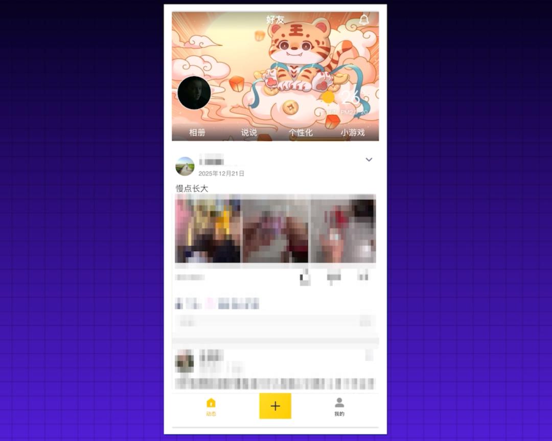 虽然 QQ 空间维持着季更,但当我打开 QQ 空间,还是那个熟悉的页面,导航栏是动态和我的,上方则分别是相册、说说、个性化和小游戏。