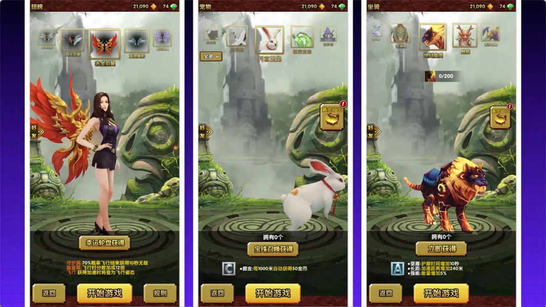 除了角色,还有翅膀、宠物、坐骑都可以氪金抽奖得到,品级越高,属性加成越好。