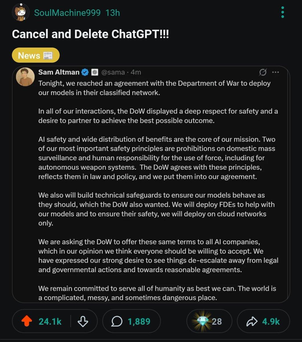 自奥特曼官宣与国防部合作后,全网掀起了一场大规模的「抵制ChatGPT」的运动,如今愈演愈烈。
