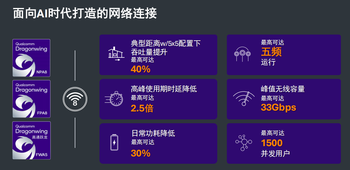 同步推出的还有 5 款全新 Wi-Fi 8 高通跃龙网络平台,包括 3 款旗舰级平台 —— 高通跃龙 NPro A8 Elite、FiberPro A8 Elite 与采用 5x5 射频架构的第五代固定无线接入平台至尊版,以及 2 款主流级平台高通跃龙 N8 与 F8。该系列平台在高负载网络环境下,可实现吞吐量最高提升 40%,峰值使用场景下时延最高降低 2.5 倍,同时通过智能电源管理将日常功耗降低 30%。值得关注的是,该系列平台搭载了 AI 原生的网络计算能力,集成高通 Hexagon NPU 与专用网络 AI 引擎,可在网络侧直接运行边缘 AI 任务,既提升终端 AI 响应速度与隐私性,也可帮助宽带运营商简化网络运维流程。