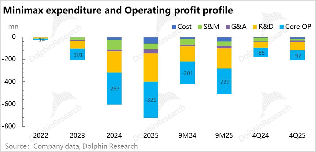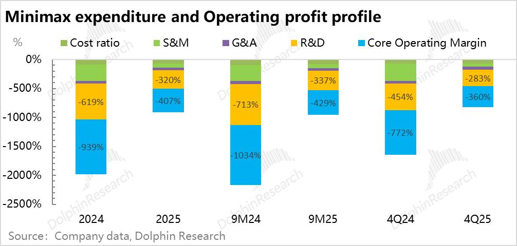 海豚君按照四季度对前三季收入平均值来估算,假如MiniMax在四季度2600万收入的基础上,每个季度还能增收800万,2026年收入如果能超过1.3亿美金,那么2026年收入对2025年2.5亿研发投入的覆盖能力才有希望维持在四季度的50%。