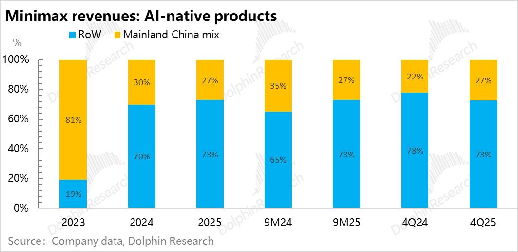 3) 海外收入占比稳定在73%:MiniMax海外收入美国、新加坡和其他地区大致平均分配。前三季度海外收入占比在海螺等推动下拉升到73%之后,并未进一步拉升,而是稳在了这个位置上。