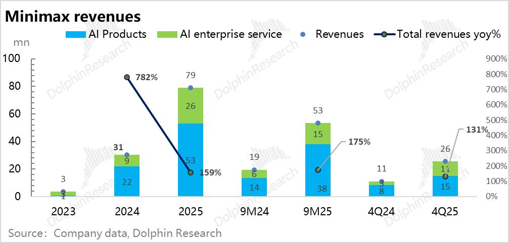 a. Minimax AI产品家族(含Minimax、视频生成海螺AI、音频生成Minimax Audio、Talkie,主要靠Talkie和海螺AI)收入小超1500万美金,同比增长从前9个月的接近150%增速砍半,回落到了82%,是增长回落的主要原因。