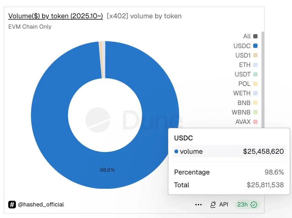 交易量数据层面,USDC 在 x402 协议交易层是绝对核心。根据 Dune 数据,自去年 10 月开始,截至撰稿时,x402 协议目前 EVM 链上交易量约为 2581 万美元左右,其中,98.6%的交易代币为 USDC,交易量约为 2545 万美元;Solana 链上交易量约为 821 万美元,USDC 交易量约为 819 万美元,占比为 99.7%。