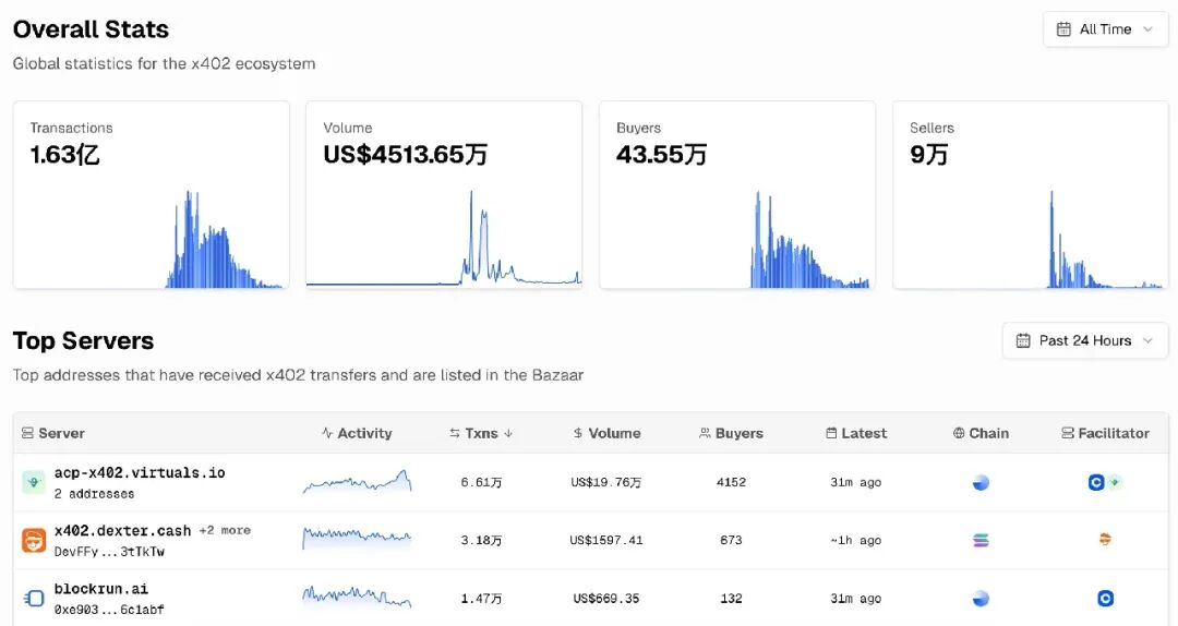 交易活跃度方面,据 x402scan.com 网站数据,截至撰稿时,全球 x402 生态系统交易笔数已突破 1.63 亿次,整体交易量突破 4500 万美元,买家 AI Agent 数量突破 43.5 万;卖家 AI Agent 数量突破 9 万。其中,Base 生态独占鳌头,交易笔数超 1.25 亿次,交易量超 3826 万美元,买家 AI Agent 数量超 41.5 万;卖家 AI Agent 数量超 7 万;Solana 生态交易笔数超 3813 万次,交易量约为 687 万美元,买家、卖家 AI Agent 数量均突破 2 万。