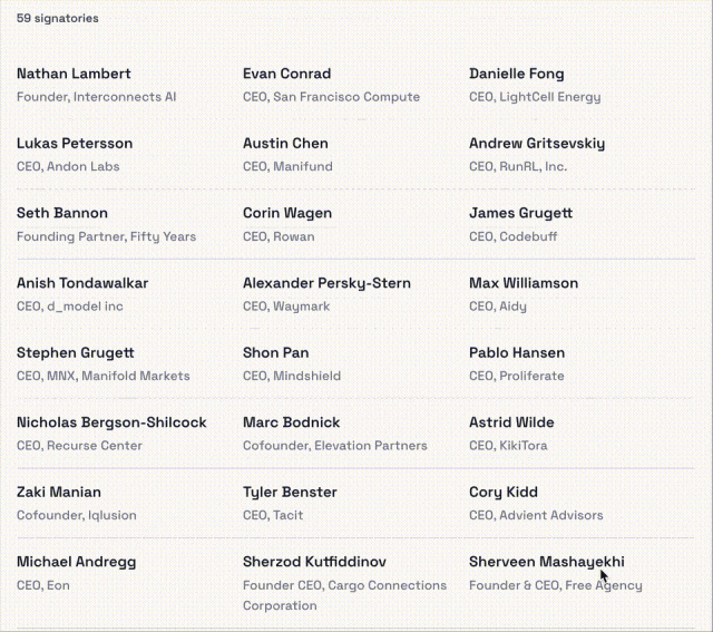59位业界大牛和CEO们纷纷落笔,还有一大批科学家和研究员集体联名声援。