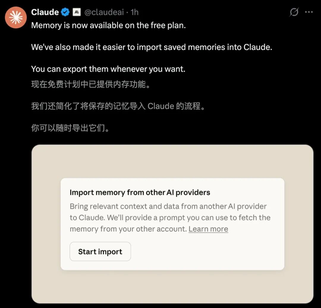继Claude面向订阅用户开启「60秒一键搬家」后,今天,免费用户也能用了。