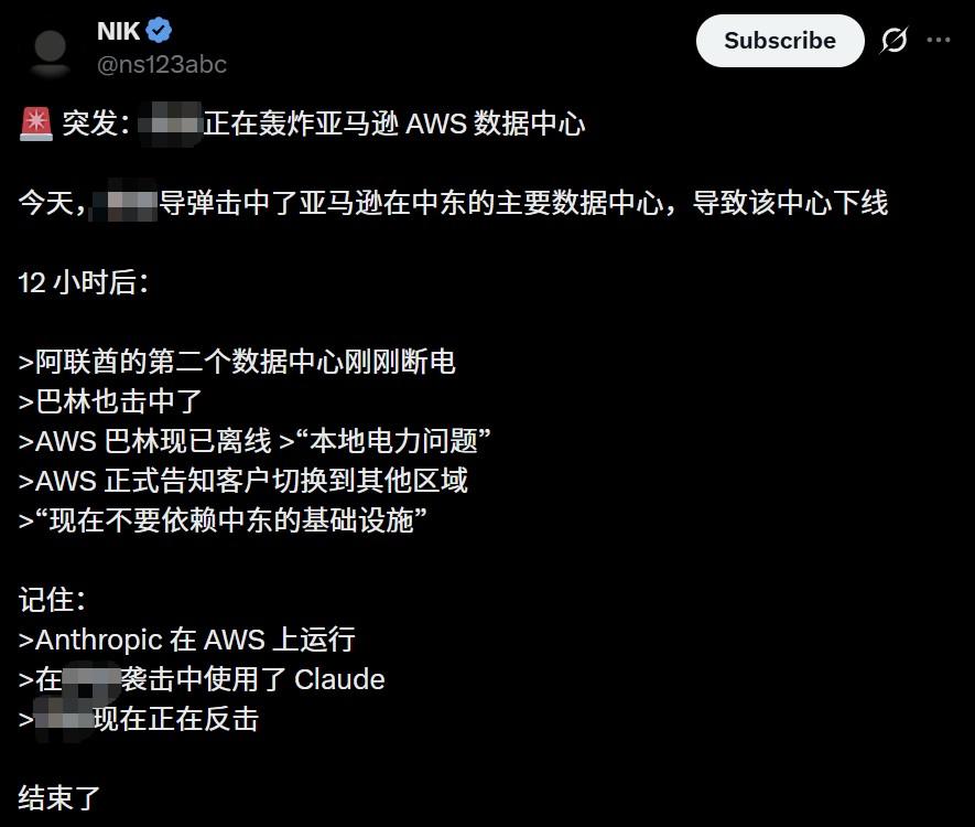 中东的基础设施挨了一发「不明物体」导致机房起火断电 → AWS算力池受到冲击 → 依赖这些算力节点的Claude模型失去支撑 → 导致了全球千万打工人无工可打的赛博大宕机。