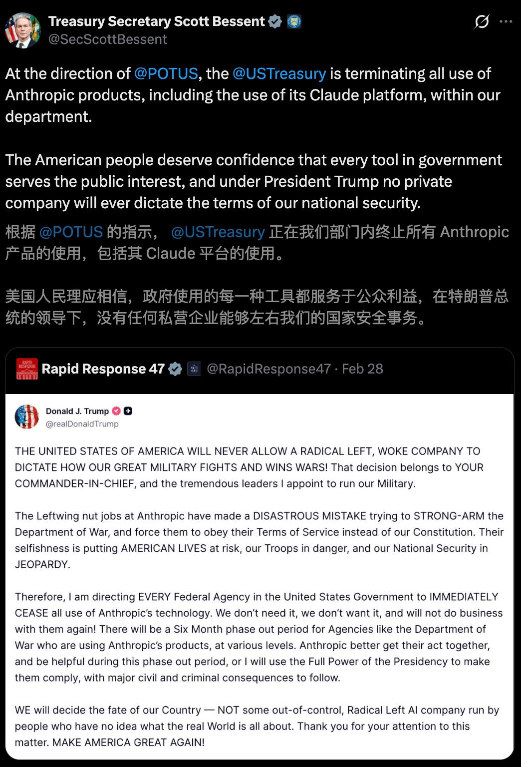 一早,财政部长Scott Bessent正式官宣:全面关停Anthropic旗下所有的AI工具。