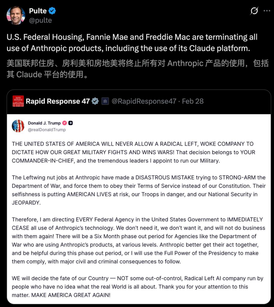 紧接着,美国联邦住房金融局(FHFA)、房利美和房地美,正全面停用Claude。