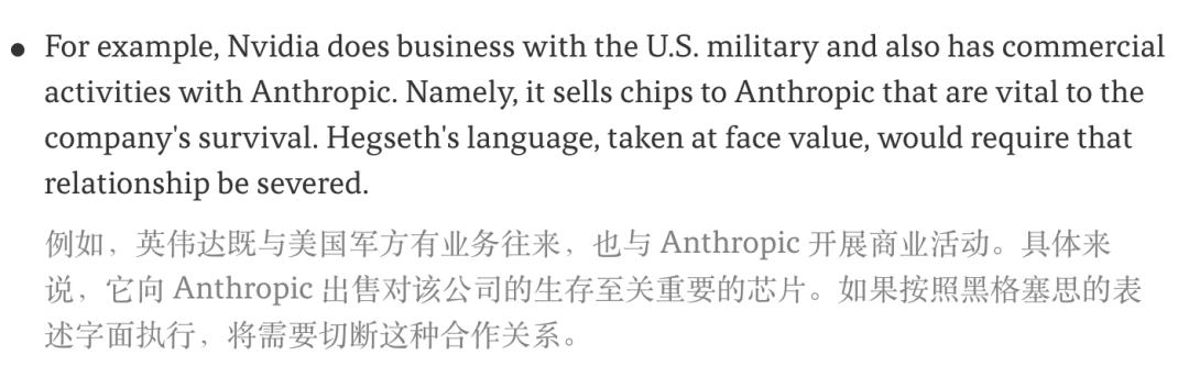如果严格执行,像英伟达这样既与美军做生意,又向Anthropic供应芯片的巨头,这种关系就得被迫切断。