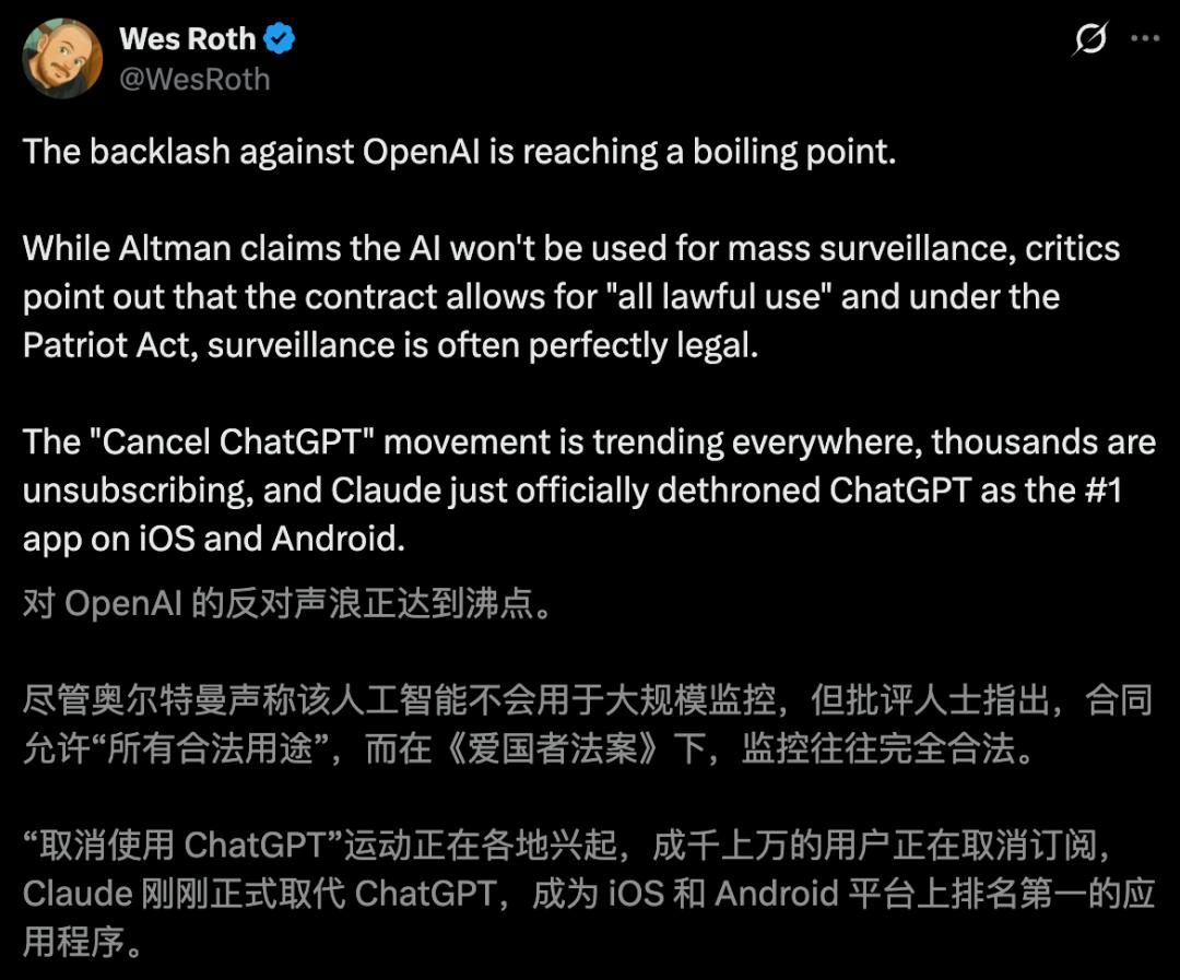更耐人寻味的是,就在Anthropic被打压的同时,竞对OpenAI却火速官宣与军方达成协议。