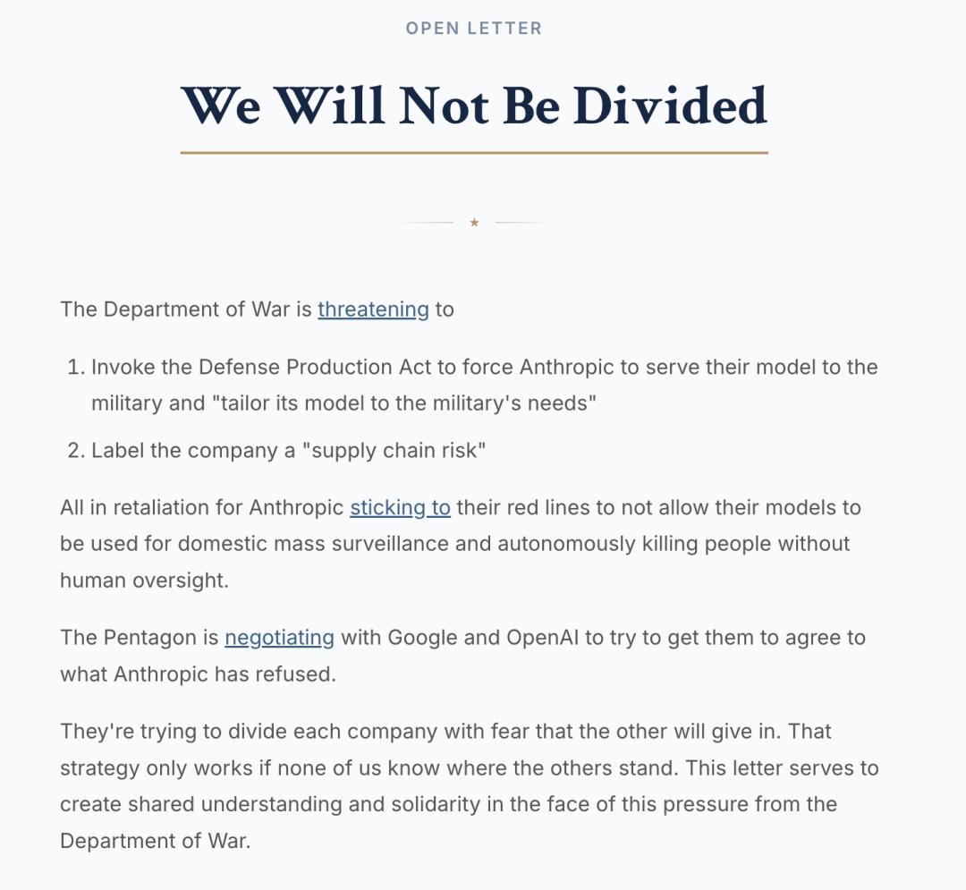 而现在,不仅仅是OpenAI、谷歌,整个硅谷的科技从业者联名,硬刚美国国防部,直接要求——