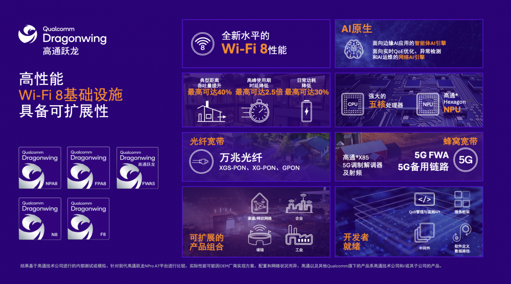 五款全新的高通跃龙网络基础设施平台,将带来迄今为止最全面的、可扩展的Wi-Fi 8网络产品组合,集成终端侧AI计算、高性能处理能力,以及集成式5G和光纤宽带支持。