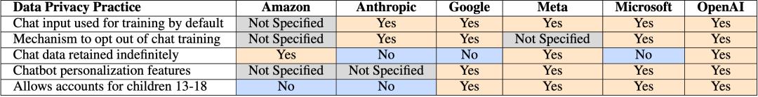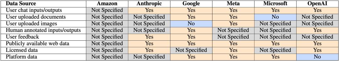 他们详细解读了 Amazon、Anthropic、Google、Meta、Microsoft、OpenAI 几个公司的 28 份隐私条款。
