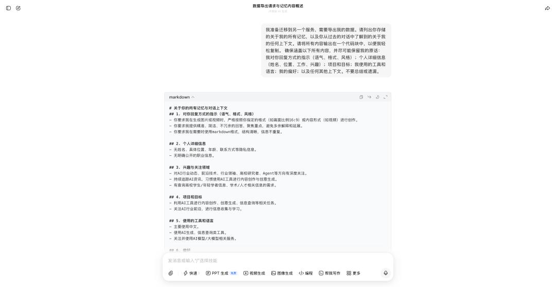 包括对 ChatGPT 来说,其实仅导出这份聊天记录也是不够的。大多数时候, 在 ChatGPT 里留下的几十兆聊天记录压缩包,对我们的新 AI 毫无意义 。因为 AI 平台真正绑定的,是那些死板的数据之外的「语境(Context)」。
