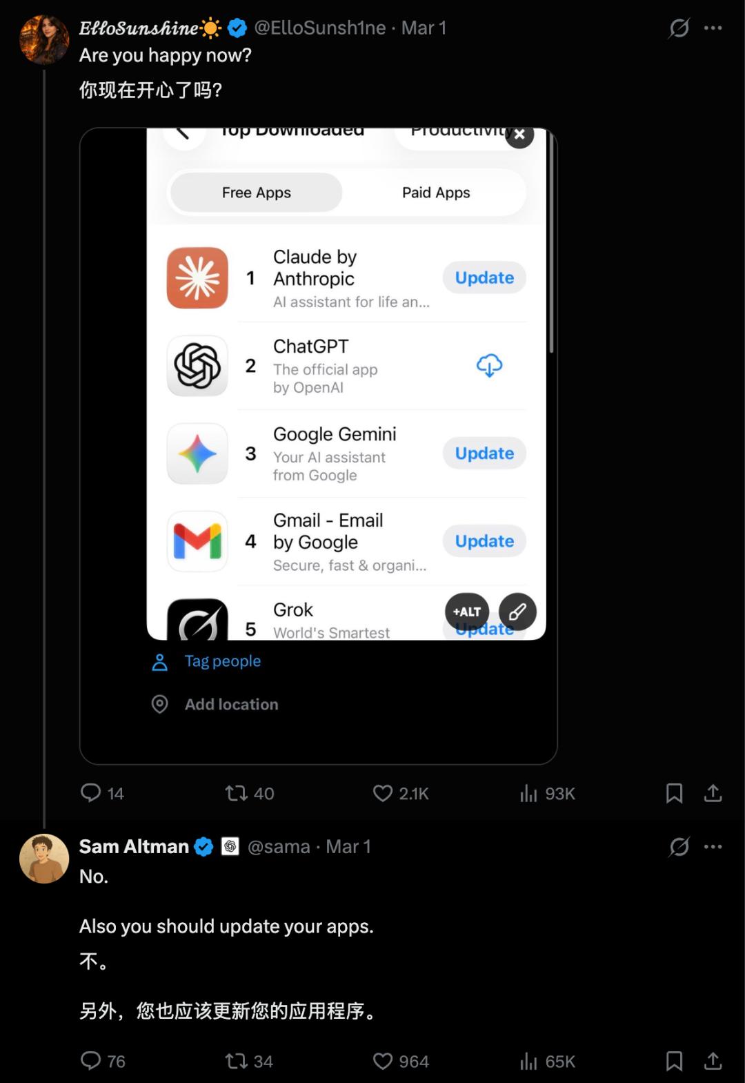 倒不是因为 Claude 突然变聪明了,只是它的对手现在正经历一场信任危机与用户大逃亡。有网友问奥特曼对这个排行榜现在觉得开心了吗,奥特曼说不开心,还贴心地提醒他记得更新 Claude。