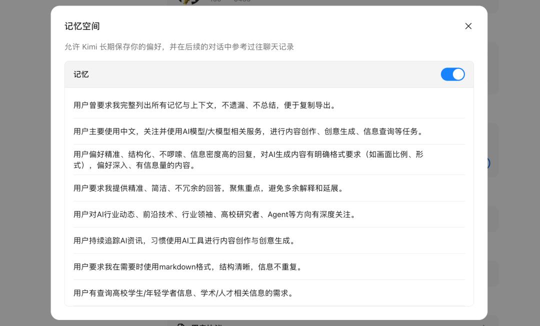 直接在 Kimi 内对话,要求它记住这些信息,Kimi 会自动更新记忆