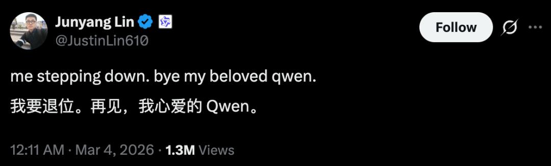 智东西3月4日消息,今日凌晨,阿里巴巴集团千问大模型负责人林俊旸在社交平台X发文称,自己将从千问团队卸任。