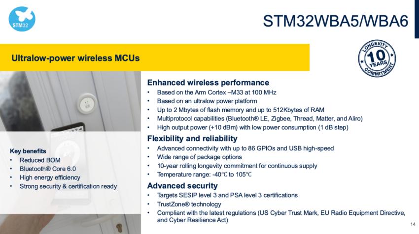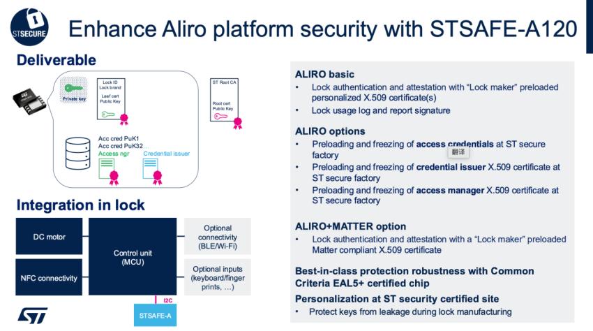 ST的MCU及无线连接产品组合,包括ST25 NFC读卡器、多种STM32微控制器(含BLE和UWB),为支持所有指定无线技术配置的Aliro设备提供了一站式服务。ST的Aliro产品还包括STSAFE-A嵌入式安全元件,用于数字密钥存储。