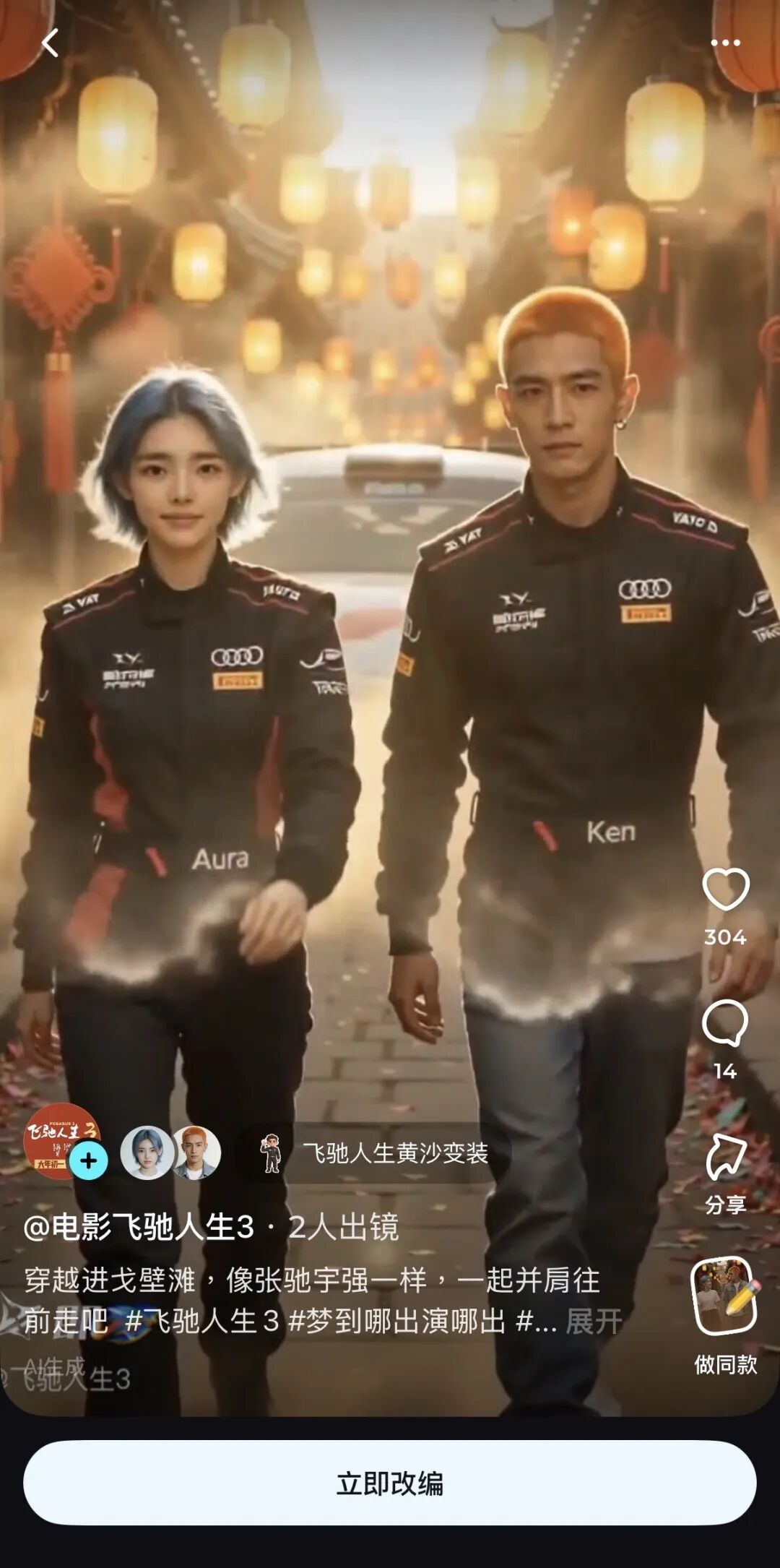 为了进一步降低门槛,即梦还设置了一键跟拍。上下滑是信息流,左右滑可以看到同一模板下的不同演绎;选中后,点击右下角即可生成同款。还有艾特他人一起合拍视频等功能,进一步深化社交属性。