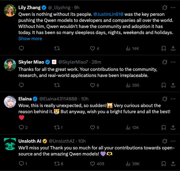 林俊旸在社交媒体上发表离职声明后全球AI行业从业者纷纷留言