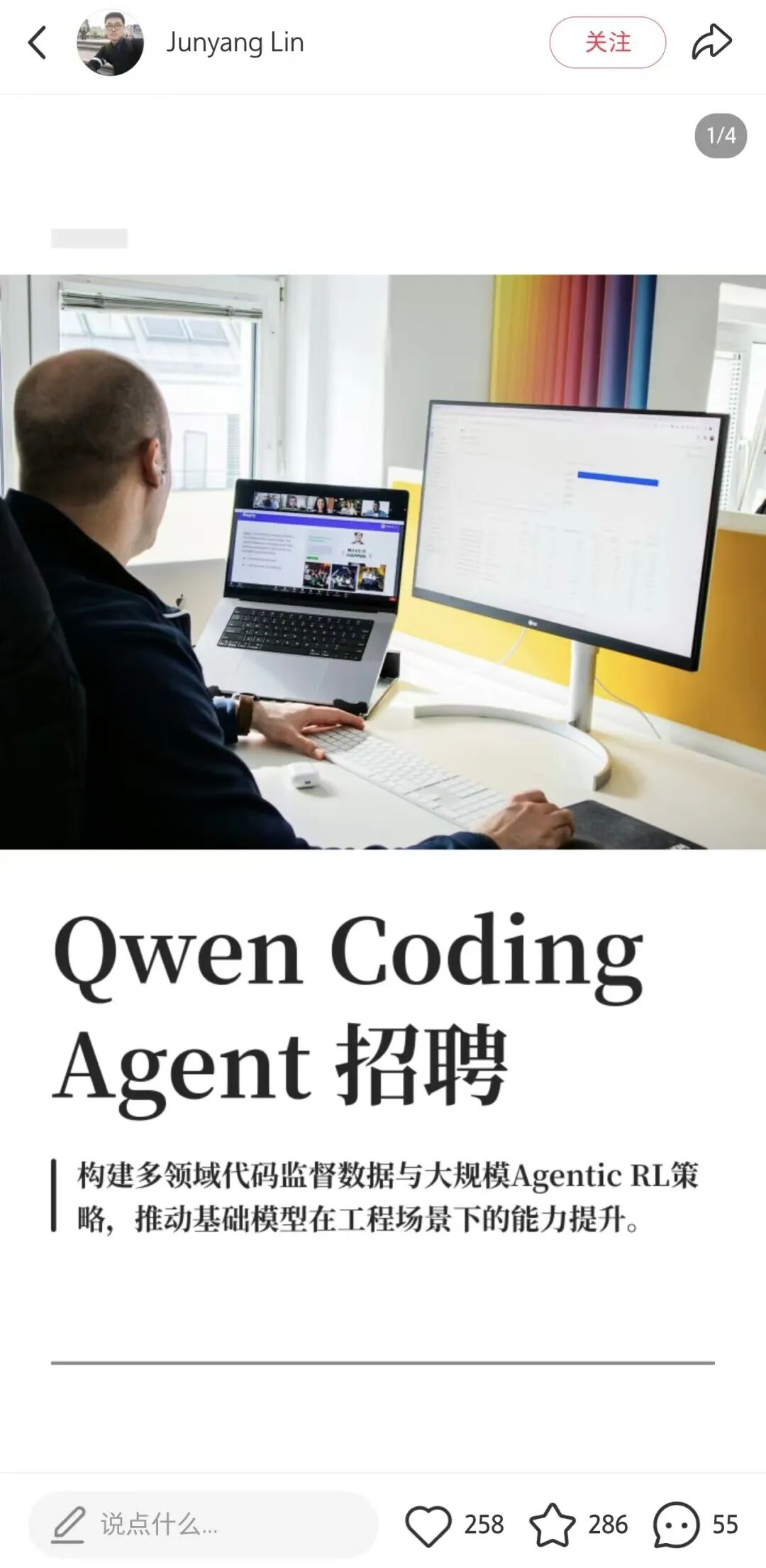 林俊旸在小红书转发Qwen Coding Agent招聘信息