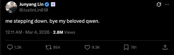 3月4日凌晨,阿里通义千问技术负责人林俊旸在X发文,表示自己将告别Qwen项目。这项变动并无太多征兆:在开源社区大获好评的Qwen 3.5春节刚刚发布,头一天还上线了轻量化模型,得到马斯克点赞。