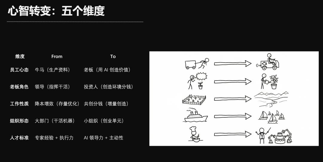 第二个卡点,是组织的心智。员工会想,AI如果能干我的活,岂不是告诉老板,AI可以替代我?所以,从组织的角度看,搞AI好像天然就站在了很多人的对立面,阻力重重。