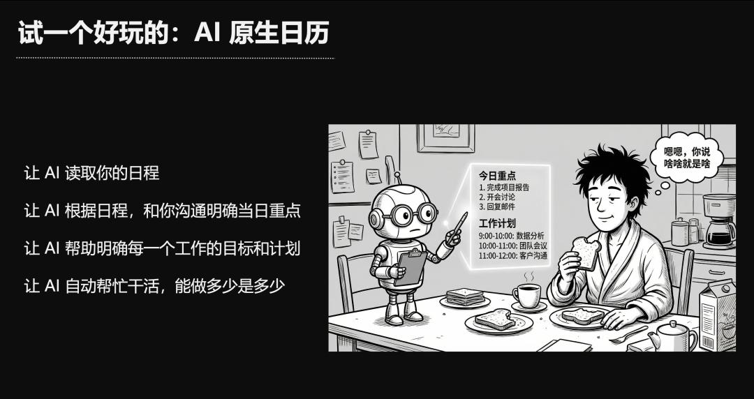 所有需要用户看说明书才会的东西,就是我们产品没做好。所有需要用户动脑子学习的地方,就是我们用AI去改造的机会。第二点,是反人性的地方,就是很多事情需要用户去集中注意力。这也是我们的机会。