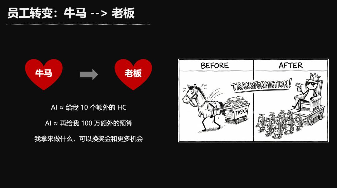 你不要把AI当做你的竞品。你就想,AI是我十个额外的headcount,帮我招了十个程序员,十个数据分析师,十个写手,十个画手……还给了我一堆预算。我拿来做什么?跟公司换更多奖金、机会,升职加薪。如果我带出一个100人的团队,创造巨大收益,老板不给我升职加薪,我可以带着这100人出走。