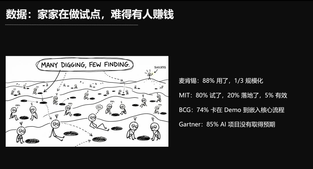 从麦肯锡、MIT(麻省理工学院)的调研来看,也是这个结论。家家户户都在做AI试点,但真正赚到钱的寥寥无几。因为这些报告调研的对象,主要都是大公司。
