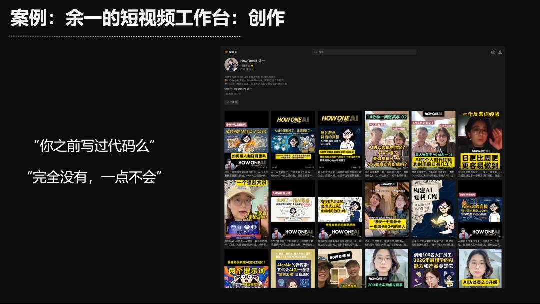 我再举一个生活中的真实例子。我有个朋友叫余一,她是个非常先锋的人——可以说是这个AI时代里最早“疯”掉的那批人。她对AI极度痴迷,她运营着自己的视频号账号,上面绝大部分视频都是AI生成的,涨粉速度惊人。