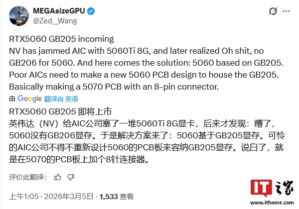 IT之家 3 月 5 日消息,英伟达现有的 GeForce RTX 5060 桌面端显卡基于 GB206 GPU,启用了该核心全部 36 组 SM 中的 30 组。而消息人士 MEGAsizeGPU (@Zed__Wang) 今晨表示,英伟达还将推出基于 GB205 核心的新版 RTX 5060。