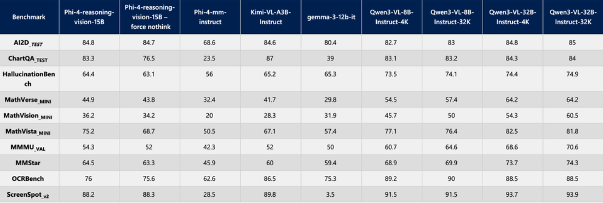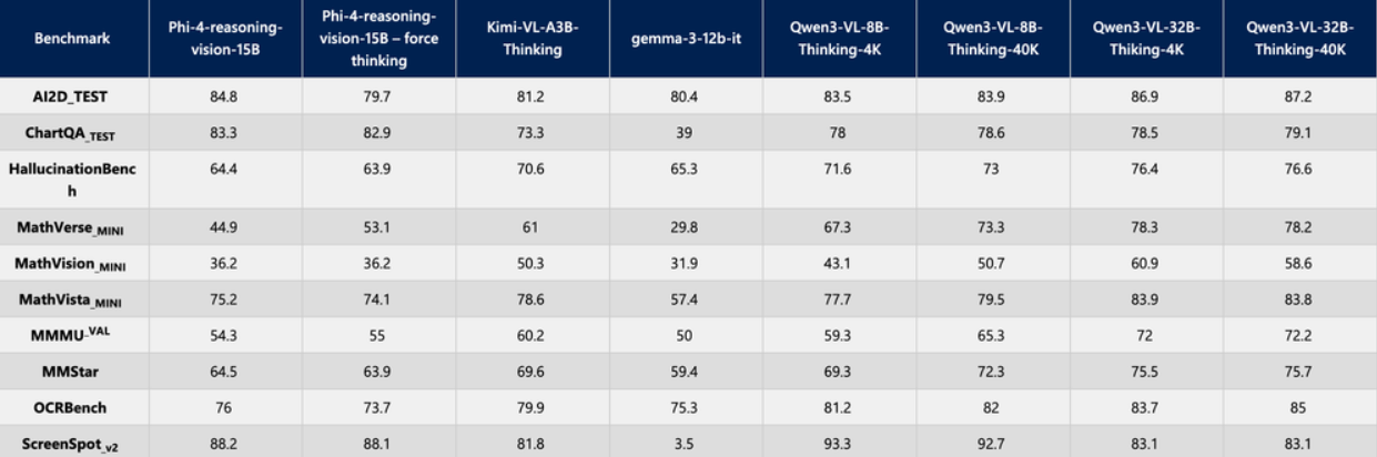 以下是 Phi-4-Reasoning-Vision-15B 与其他模型在关键任务上的性能对比: