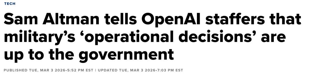 周二,在公司的全员会议上,奥特曼以前所未有的姿态,回应了员工对五角大楼订单的质疑。