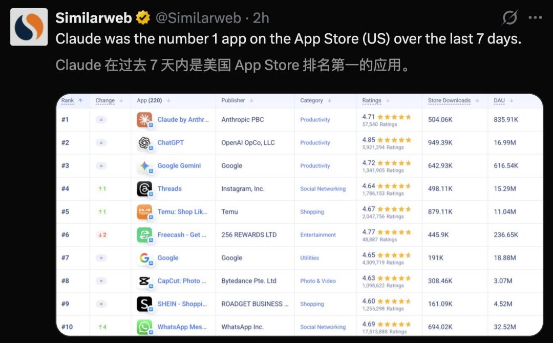 这种疯狂的增长,主要归功于Claude的强大表现。