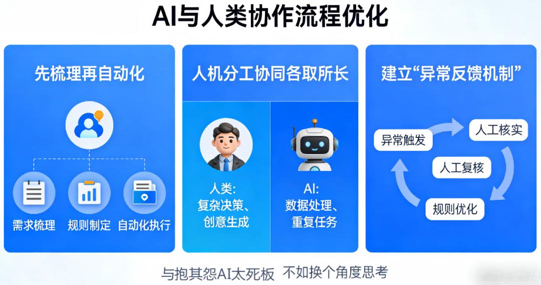 人机分工协同,各取所长:对于那些确实难以标准化的环节,暂时留给人来做。AI负责80%的标准流程,人负责20%的异常处理和决策
