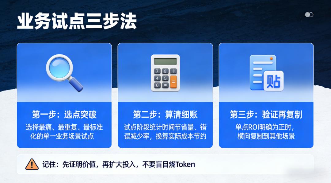 选点突破:选择一个最痛、最重复、最标准化的单一业务场景进行试点;