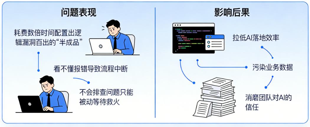 自媒体把OpenClaw吹得天花乱坠,部署简单、上手即用,于是一些传统企业的业务部门自行采购部署,结果要么是业务人员耗费数倍时间却只配置出逻辑漏洞百出的“半成品”,要么是因看不懂报错、不会排查问题而导致流程中断后只能被动等待救火,最终不仅拉低了AI落地的效率、污染了业务数据、消磨了团队对AI的信任,一些企业领导甚至将部署与应用任务直接甩给业务人员,要求其快速出成果,结果就是让优秀的业务人才在偏离核心价值的“四不像”岗位上陷入职业迷茫,既要应付繁杂的工作,还要对着看不懂的配置界面摸索,时不时跳一堆报错,好不容易配置一个任务出来,最后发现对工作毫无价值,还消耗了大量Token,而企业则在“看似省钱实则更贵”的隐性成本中,错失了AI赋能的最佳窗口期。最终“龙虾”由“玩具”变成了“烫手山芋”,当初采购时的信誓旦旦,变成了摇头叹息。