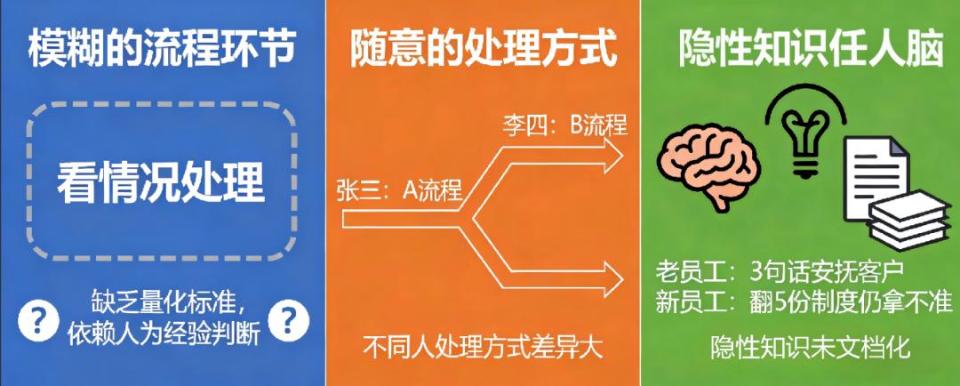 靠人脑补的:很多隐性知识没文档化,比如客户投诉处理,老员工凭直觉三句话就能安抚,新员工却要翻五份制度文件还拿不准分寸。