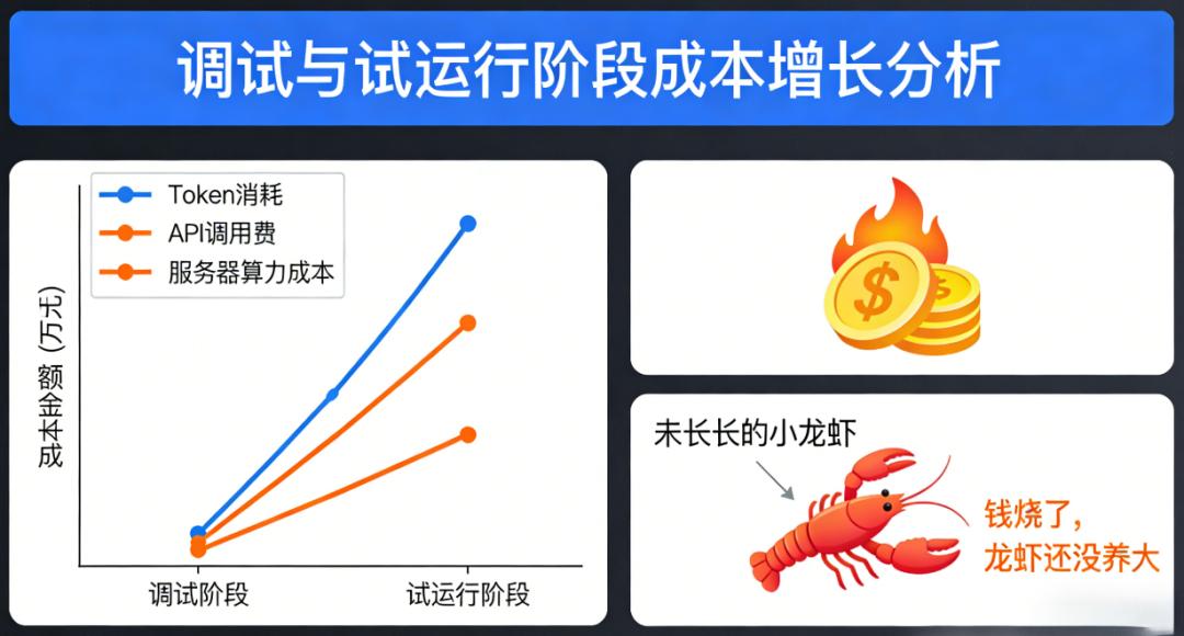 当前传统企业养龙虾除了面临技术瓶颈,第二大问题就是成本:Token消耗、API调用费、服务器算力成本,说实话养龙虾真的很烧Token!尤其在调试和试运行阶段就已经开始烧了,大部分情况下钱烧了,龙虾还没养大。还有一种情况就是龙虾刚养大,突然又冒出了一个更强大的“龙虾2.0”,不仅成本低、操作还更简单,导致前期投入全部沉没,企业陷入“追新陷阱”,在技术迭代中疲于奔命却难见实效,既无法沉淀可复用的AI能力资产,又错失业务场景的深度优化机会。最担心的还是企业领导的短视行为,把AI当成了“一次性投资”,但它实际上是“持续性运营”。就像养一只真龙虾,饲料钱是持续投入的,而不是买回来就完事。当领导觉得“饲料”太贵时便可能停止投入,最终采购的服务器变成废铁。