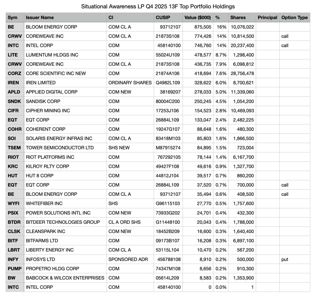 Situational Awareness LP 的前十大持仓占比高达 86%,策略上高度集中,主要布局能源、算力、光通信和存储等领域。