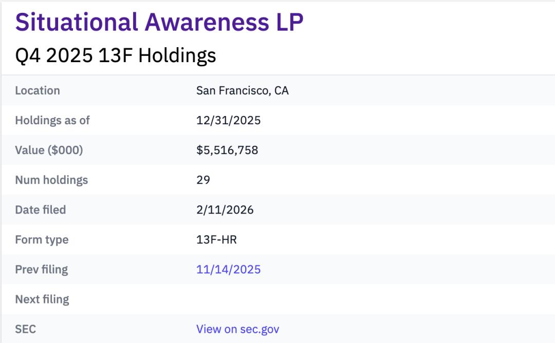 根据 Situational Awareness LP 所披露的 13F 文件(SEC 对资管规模超 1 亿美元的基金所要求的季度披露文件),2024 年 Q4 之时,Situational Awareness LP 的公开持仓总价值还“仅”有 2.55 亿美元,而在今年 2 月 16 日刚公布的 2025 年 Q4 持仓披露中,该数字已增长到了夸张的 55 亿美元。