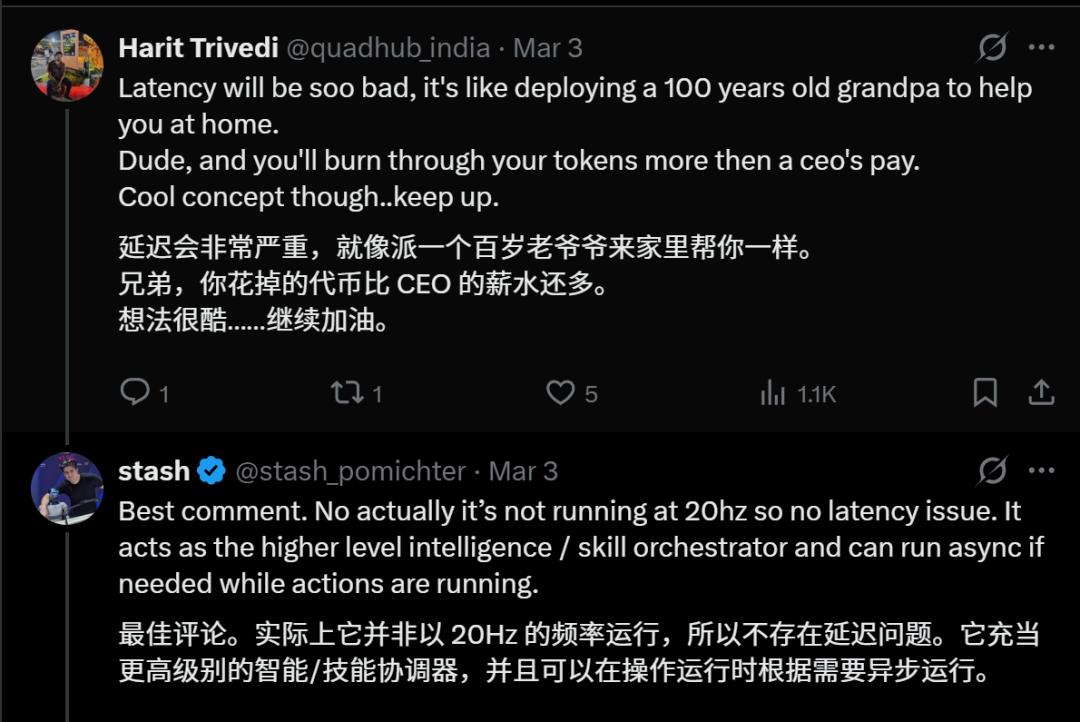 但技术团队火速打脸表示:「不,它并不是20Hz跑实时控制,而是高层智力协调器。它负责指挥,动作运行可以异步,完全不卡顿!」