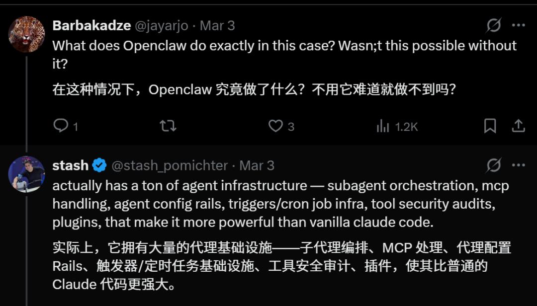 而OpenClaw提供的,不仅仅是一个输入接口,而是包含了一整套代理基础设施(Agent Infrastructure):子代理编排、MCP(多点协作协议)处理、工具安全审计、插件系统。